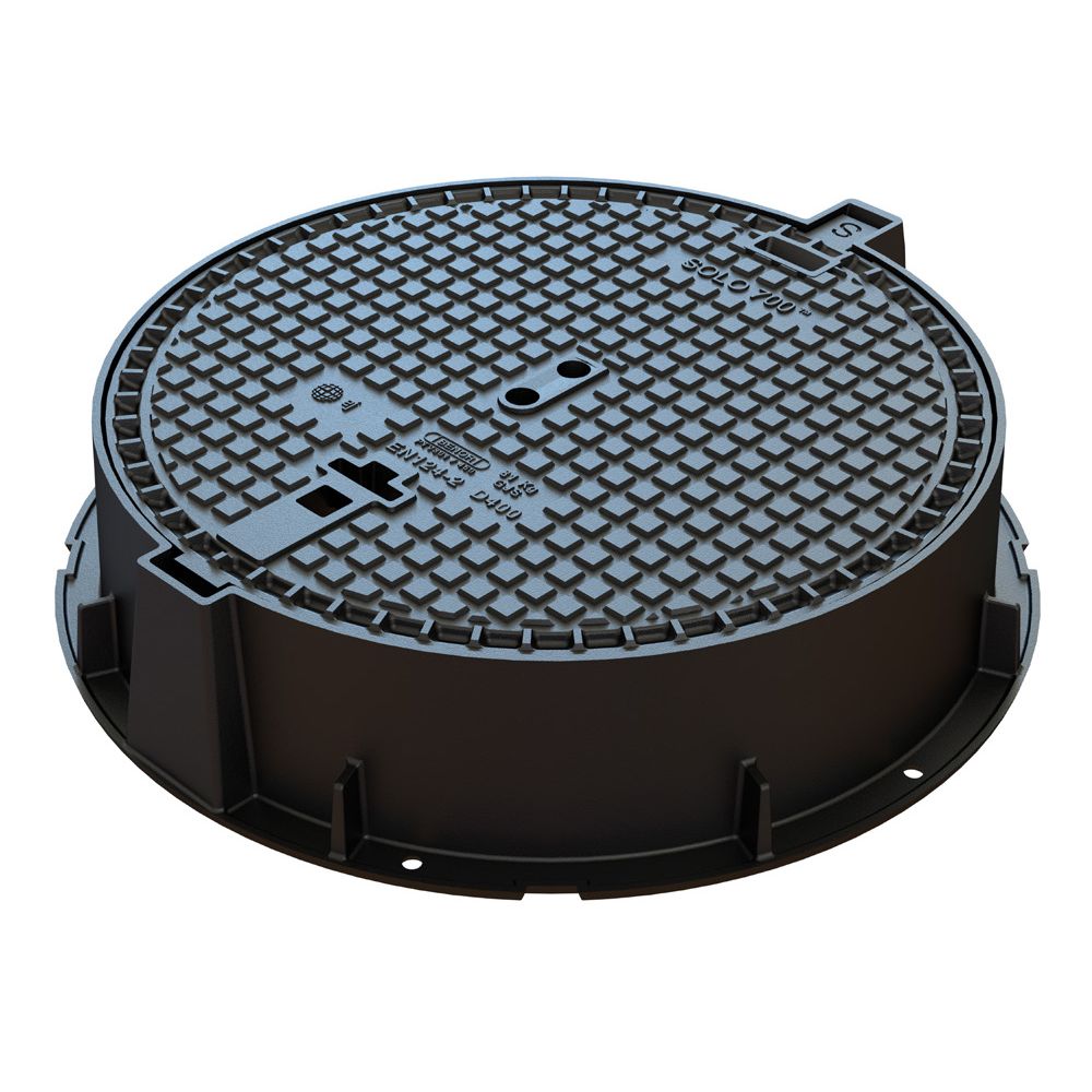Hinged road cover Ø700 with circular frame. Elastic joint with a width of 27 mm under the entire seating of the cover. Self-cleaning hinge. Anti-blocking safety device at 90°. Anti-slip surface. Factory-treated with water-based black paint in accordance with SB 250, version 4.1. Cover removable at 120°.