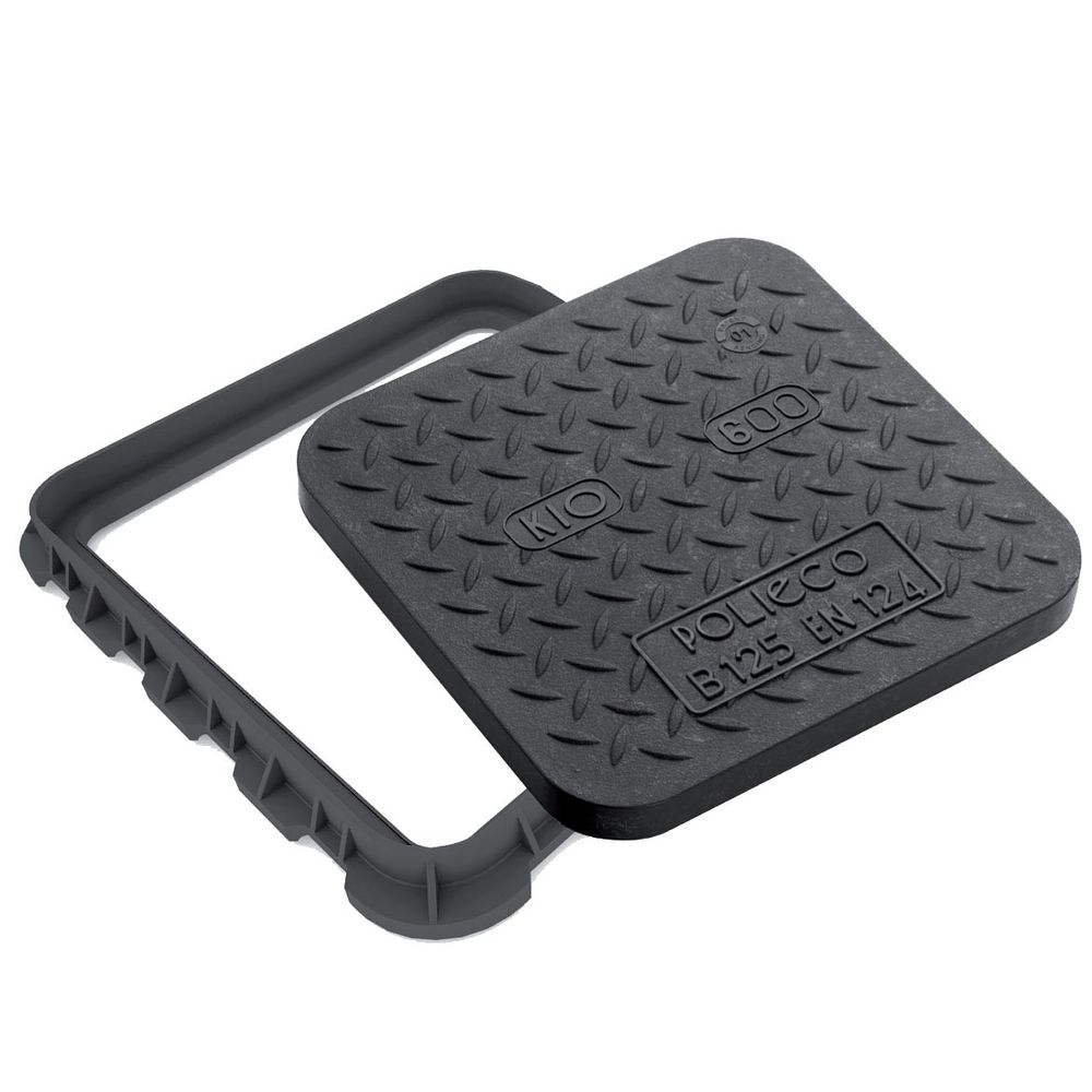 A composite manhole cover with an anti-slip surface. Marked with the load class, reference standard, manufacturer’s name, and a quality mark issued by an internationally recognised institute. Equipped with special anchoring flaps for secure fixing during installation.