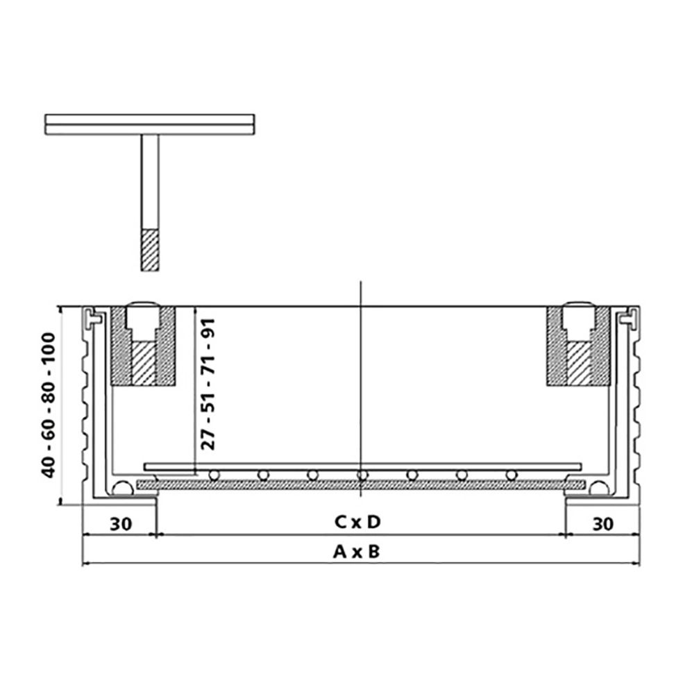 Tile and paving lid made of extruded aluminium. The lid is freely seated in the frame. Equipped with a reinforcement mesh. 3 mm galvanised steel plate as base plate. Two seals: one on the bottom and one on the side of the outer frame. T-shaped rubber with triple function: prevents the ingress of dirt, provides a spring effect to reduce stress between the infill cover and the frame, and ensures additional odour sealing. |