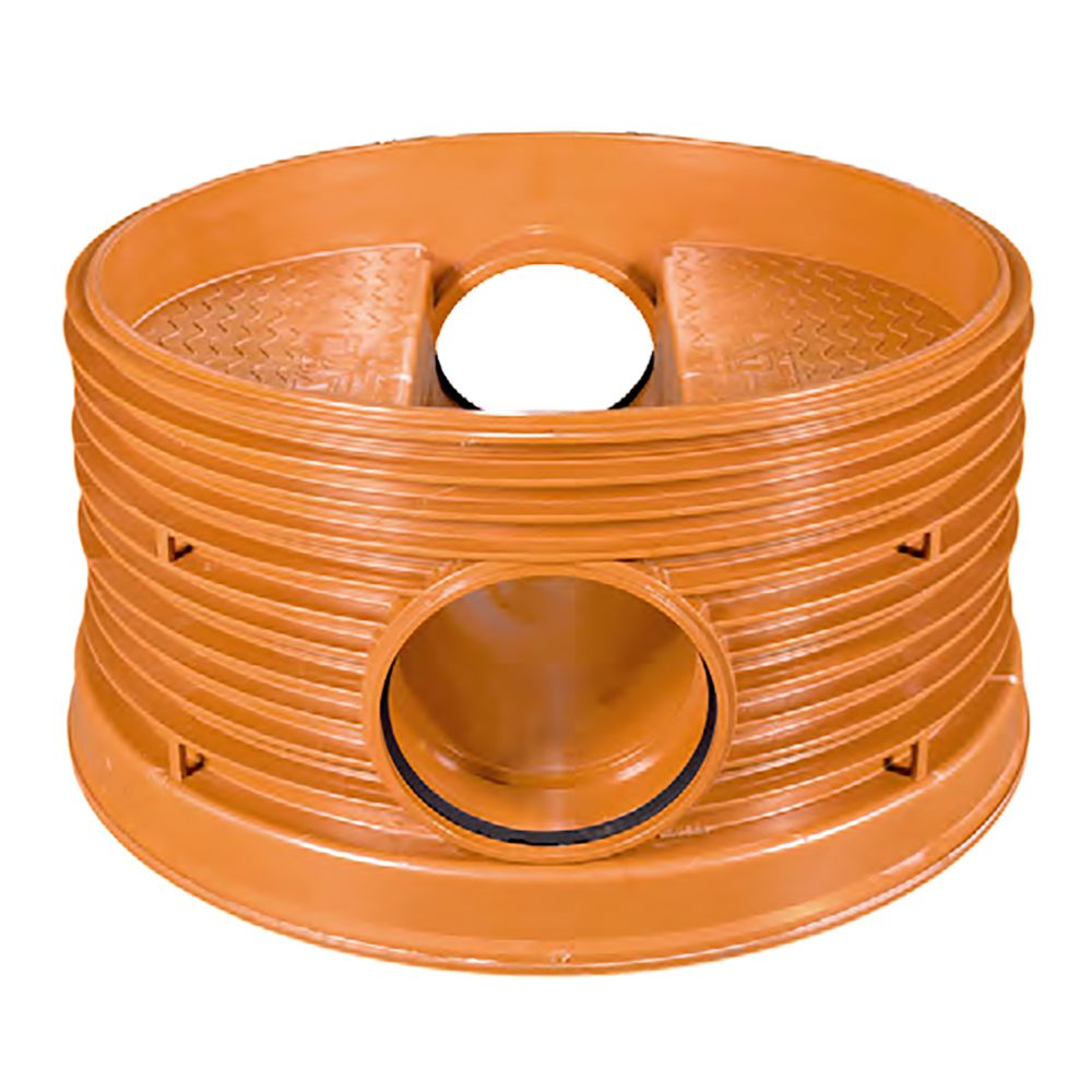 Profiled manhole base composed of an injection-moulded manhole body, equipped with reinforcing ribs, steps and a flow profile adapted to the outlet diameter. Suitable for connection to ribbed PP pipes. The connections are fitted with fixed lip seals. The manhole body is equipped at the top with a riser collar with lip seal for watertight connection of a ribbed PP DN1000 riser pipe. Maximum installation depth: 6 m Permissible groundwater level: 5 m Traffic load: SLW60