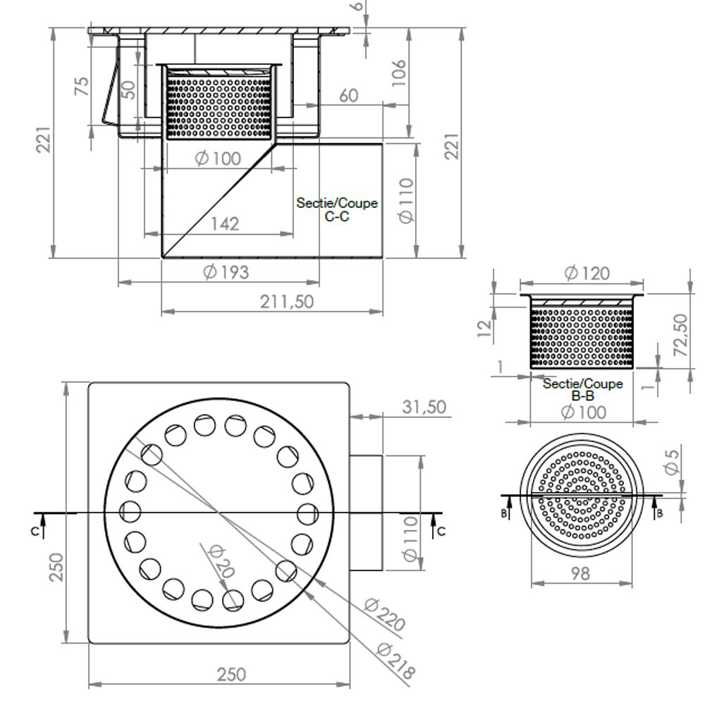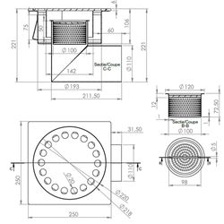 SS BELL GRATE 25X25CM W/ BASKET Ø110 HORIZONTAL