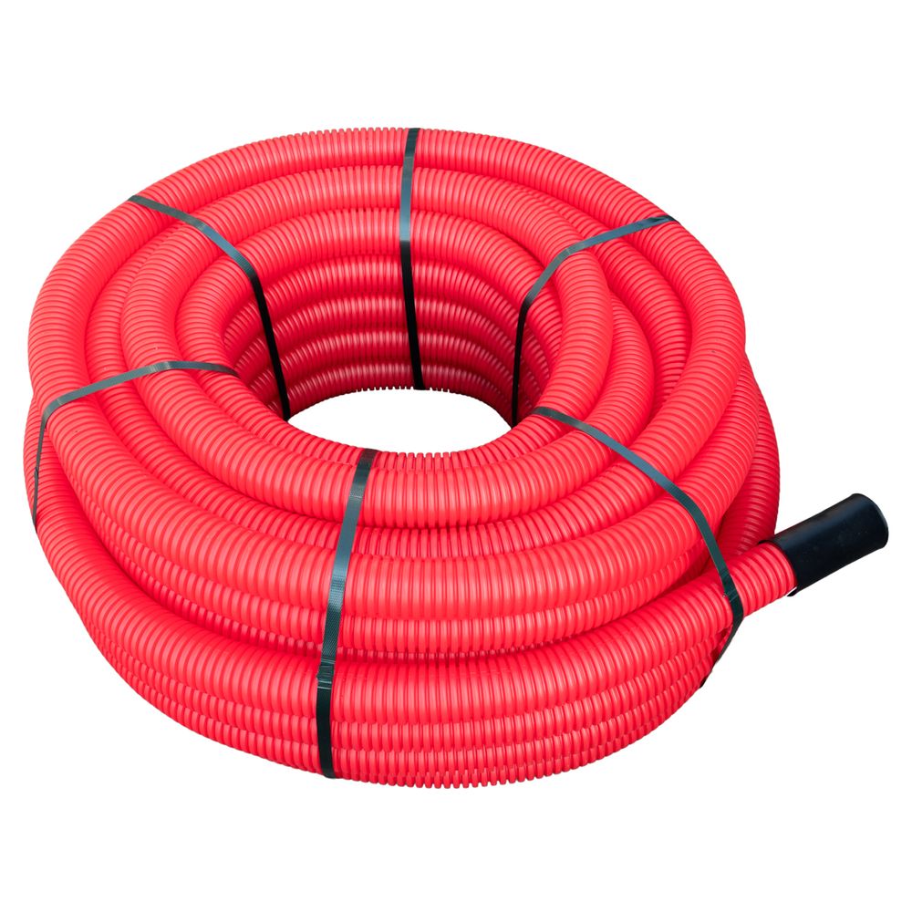 PE kabelbeschermingsbuis met mof en trekdraad (PET) volgens Europese norm EN 50086-2-4 (systemen voor buizen voor aanleg in de grond voor elektrische installatie). Buizen zijn dubbelwandig: inwendig glad zwart of wit LDPE, uitwendig geribd rood HDPE De buis is voorzien van een nylon trekdraad |
