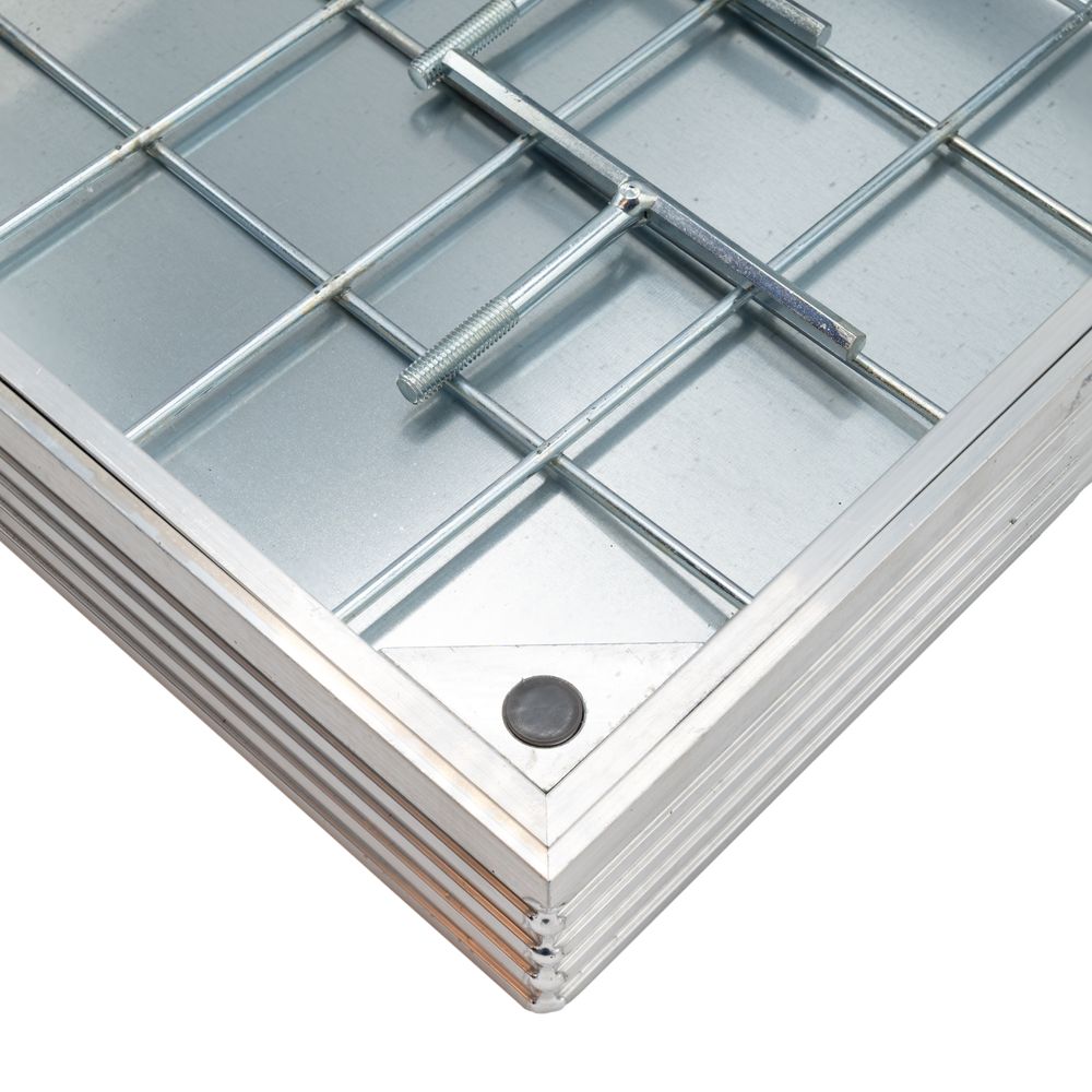 Tegel- en klinkerdeksel vervaardigd uit geëxtrudeerd aluminium. Het deksel ligt vrij in het kader. Voorzien van een betonnet. Verzinkte staalplaat van 3 mm als bodemplaat. Twee dichtingen: 1 op de bodem en 1 in de zijkant van het buitenkader. T-rubber met 3-voudige functie: verhindert vuilresten, verend effect verminderd spanning tussen vuldeksel en kader en extra reukafsluiting. |